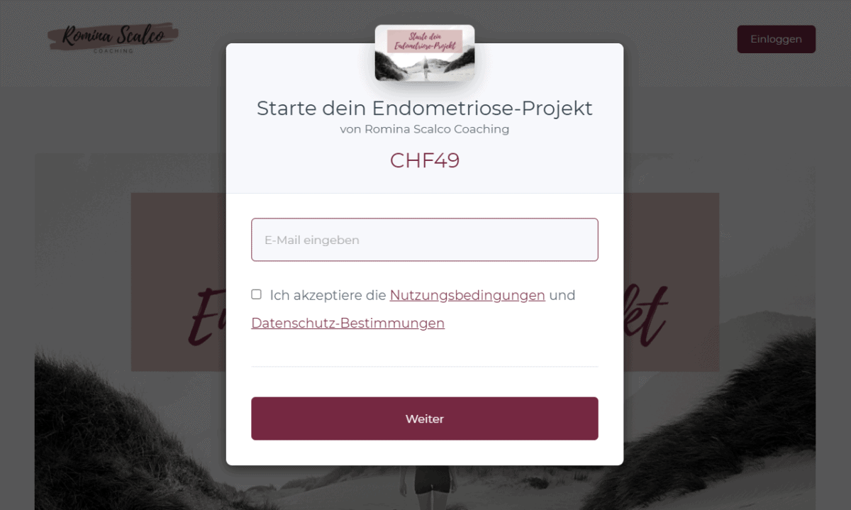 Schritt 2: Es erscheint folgende Eingabemaske, wo du bitte deine Mailadresse einträgst. Mit dieser Mailadresse wirst du dich später auch auf der Kursplattform einloggen. Bitte beachte, dass ich die Mailadresse aus dem Kaufprozess via Digistore24 mit der Mailadresse, mit der du dich auf Podia registrierst, abgleichen werde. Solltest du verschiedene Mailadressen nutzen, kann es daher zu Rückfragen meinerseits kommen. Akzeptiere bitte zudem die Nutzungs- und Datenschutzbedingungen. Klicke anschliessend auf „Weiter“.