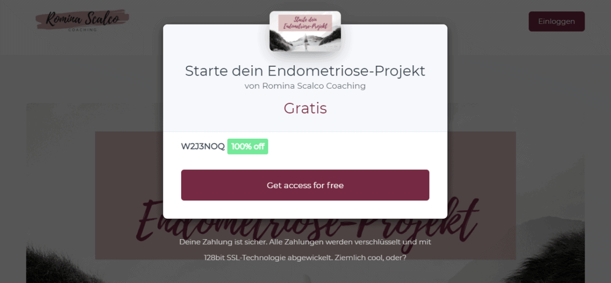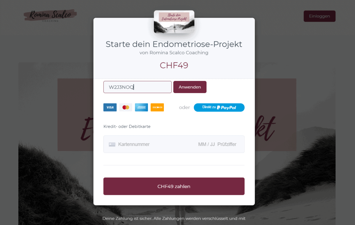 Schritt 4: Rabattcode eingeben. Gib nun den Rabattcode W2J3NOQ ein und klicke auf „Anwenden“, um auf die Kursinhalte zugreifen zu können. Bitte beachte, dass ansonsten ein weiterer Zahlungsauftrag ausgelöst wird!