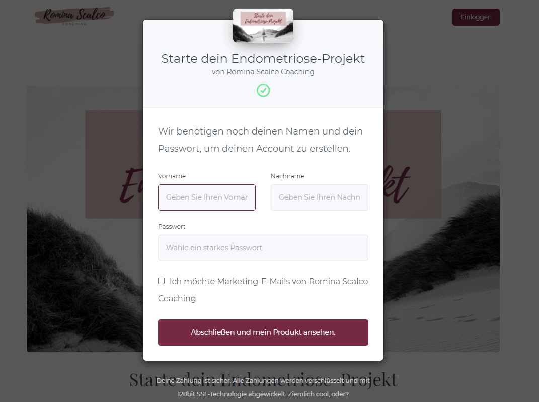 Schritt 5: Registrierung abschliessen und loslegen! Du kannst jetzt deine Registrierung fortsetzen bzw. abschliessen, indem du ein Passwort für dich festlegst. Damit kannst du dich ab sofort bei der Kursplattform Podia einloggen, um die Kursinhalte zu sehen.